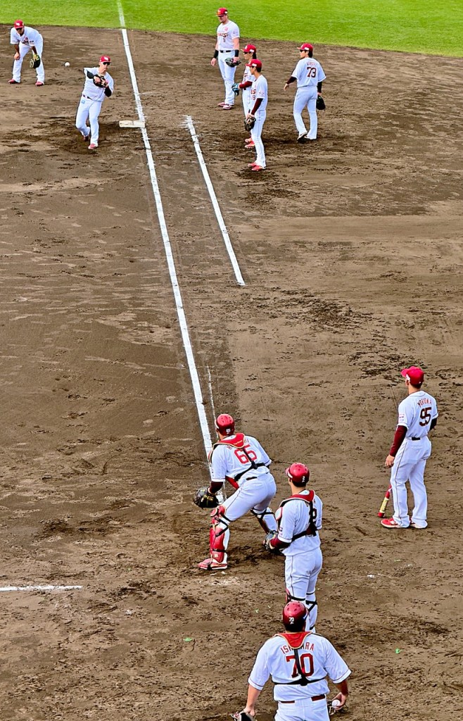 - Teams in the U.S. nowadays rarely take infield before a game, but it remains a staple of all the Japanese teams. It’s just one indication of their focus on fundamentals, and it’s entertaining to see them go through it so crisply. Infield ends with a foul popup to the catcher, and the fans always cheer when he catches it.