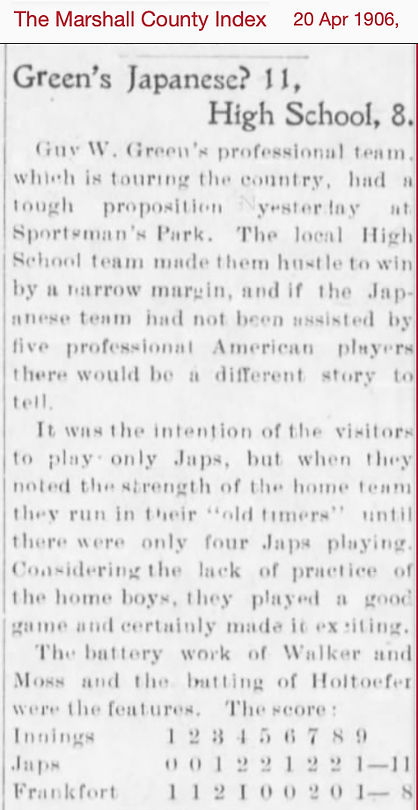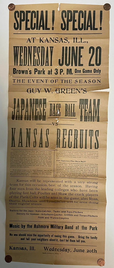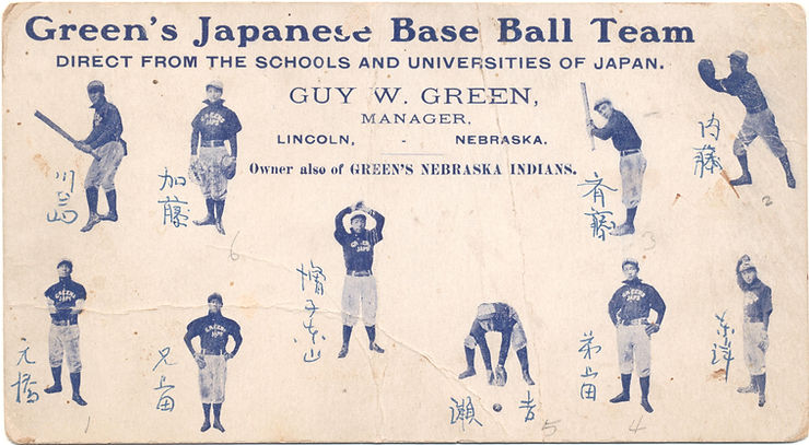 In 1906 much of United States was enthralled by Japan and all things Japanese. Japan had just emerged as the improbable victor in the Russo-Japanese War and the year before the Waseda University baseball club had toured the West Coast. Guy W. Green decided to capitalize on the fad by creating an all-Japanese baseball team to barnstorm across the Midwest.
