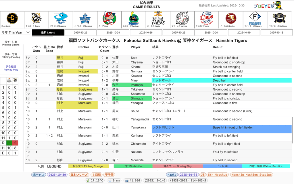 A: Box scores, batting, and pitching I’ve got all the way back to 1936. Unfortunately play by plays and the actual breakdown of what happened at each at bat is from 2016 on which I really wish wasn’t the case. I did make some design decisions which are probably a bit confusing like the box scores being shown vertically rather than left to right. That’s primarily because of when games went over 12 innings. The Chunichi Dragons had a double header back in 1942 where the first game went, I want to say 18 innings, then the second a record 24 or somewhere in there, so the vertical box scores are purely so if someone jumps back in time the box scores are not going to run off screen.