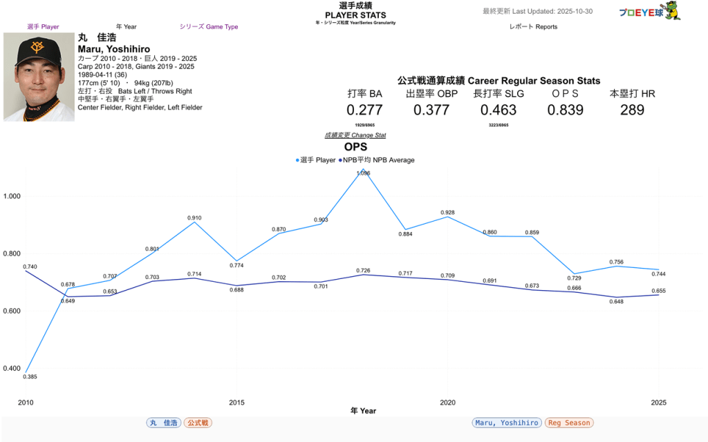 Third is the ‘Reports.’ By default, I show a line graph if you’re in the player and team reports, and a scatterplot of teams in the multi report. But that’s just one of the visuals you can show. In the upper-right of all these reports you’ll see a button also called ‘Reports’ which I probably should have termed differently, that allows you to visualize the data in all sorts of different ways. For example, you can view a bunch of tables broken out in different ways. Using the multi report example again you can for instance remove the 2025 filter to show all years in NPB history, but then add an ‘active player’ filter from the ‘Types of Player’ section to remove retired players from the data, and then you could select the ‘Player Batting Stats – Cumulative’ report from the dropdown to see all active players’ career stats basically as one line-item each. If you wanted that broken out by year you could use ‘Player Batting Stats – By Year’ and then you’ll see one row for every year for every player. The visual report I like to play with most is probably the ‘Player Scatterplot – By Year’ one as it’ll literally add a dot for every player and you can quickly plot them by things like OPS to see how everyone is performing, and you can color code it by team or their position. So, lots of ways to visualize things.