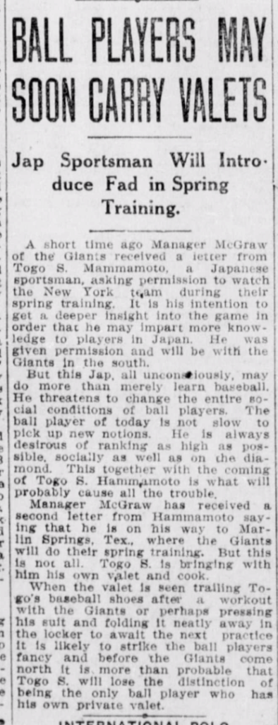 The next day, Graham ran a column praising the Asahi and encouraging local pride in the team as representatives of San Jose. A large photograph of the team ran at the top of the sports section, remarkable in that images of local teams rarely appeared in either American or Japanese American papers at the time. The caption read in part: “The Japanese Asahi baseball team will leave San Jose on the first leg of its joumey to the land of cherry blossoms this morning, when it takes the train to San Francisco where it will stay until Saturday, when it will embark on the President Cleveland for Japan.”