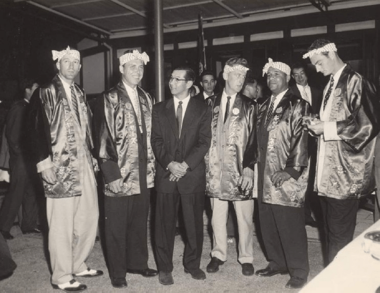 Despite the delay and relentless drizzle, thousands of flag-waving fans lined the 12-mile route from Haneda Airport to downtown Tokyo. Although many of the players longed for a shower, a warm meal, and a soft bed, they would not see their hotel for hours. After a brief stop at the Yomiuri newspaper’s headquarters, the team went straight to a reception at the famous Chinzanso restaurant. As they arrived, the hosts presented each visitor with a happi coat made to resemble a Dodgers warmup jacket and a hachimaki (traditional headband). Dressed in their new garb, the Dodgers mingled with baseball officials, diplomats, and Japanese ballplayers for several hours. Exhausted, the Dodgers finally checked into the Imperial Hotel around 9 P.M. Some of the younger players, however, went back out, attending “a giddy round of parties” before staggering back to the hotel in the wee hours of the morning.8